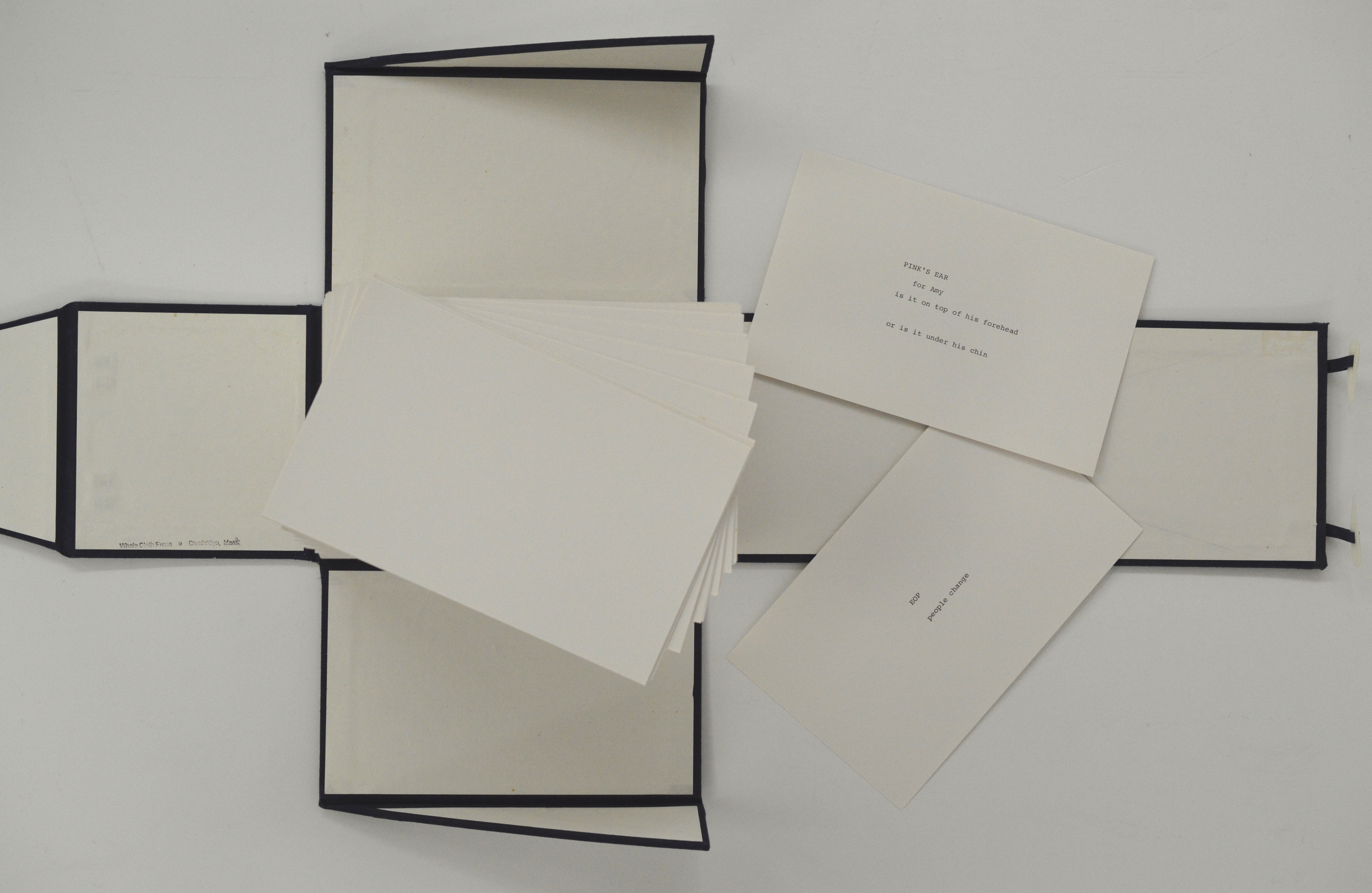 But, and here’s the joy and the bane of my library experiences, there are cut-off times, I only had between 10am-1pm to read it as I had to get back home to pick up the kids. So by pack “8 of 26” it was 12.30pm. And here’s a thing I knew from the start, from speaking with the incredibly helpful archivists, the title pages in Sentences were catalogued last: when Bury received the thing the title page cards were at the bottom of the pile so they classified them as such. There is a single card for copyright, another for description of composition/font/cardstock/edition and one which is the title page, along with 3 blank cards (making 6 non-poem cards). As I needed to read these cards before I left I switched from pack 8 to pack 26. Pack 26 contained 5 of the title cards, all but the title page.