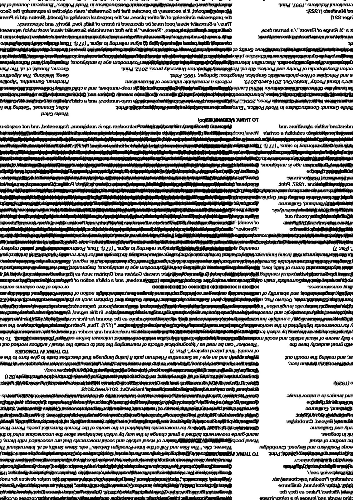 “Revolver” can be read as / typographical effects of rearranging the text to create the visual / artifices worked out with great audacity have the advantage of bringing to life “a visual lyricism which was almost unknown before our age” (Friedman, par 8).