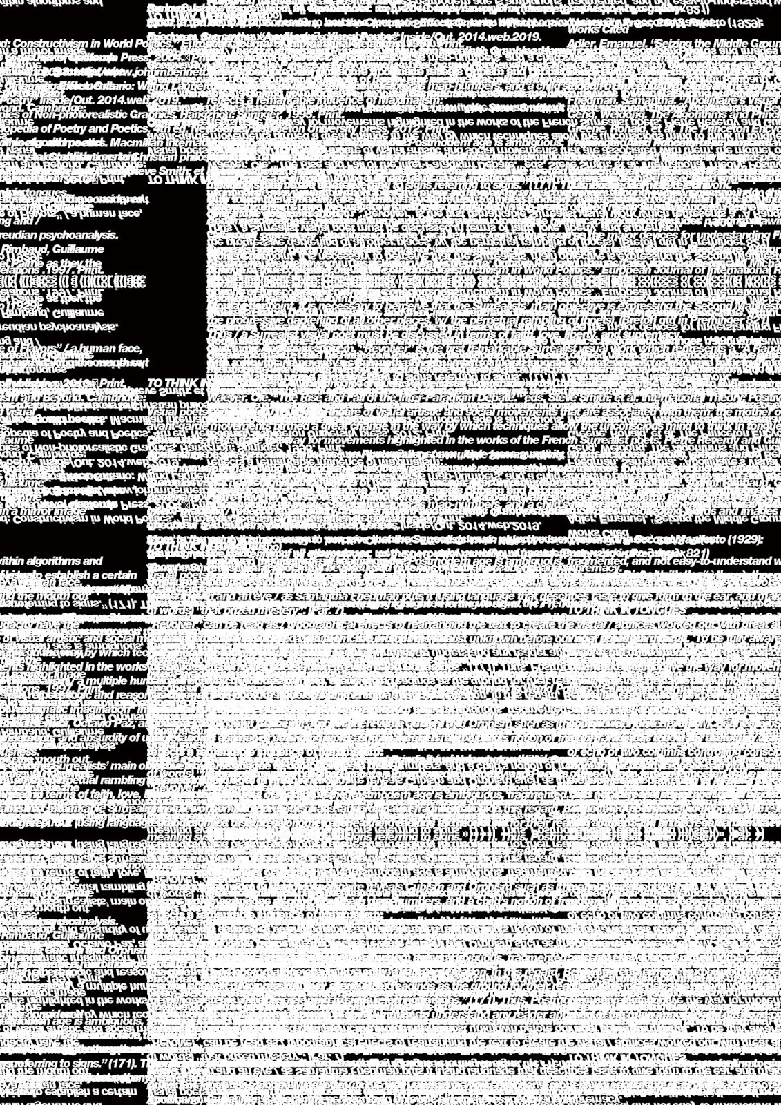 Thus / a Surrealist visual poet must be discussed in terms of faith, love, liberty, and supremacy /