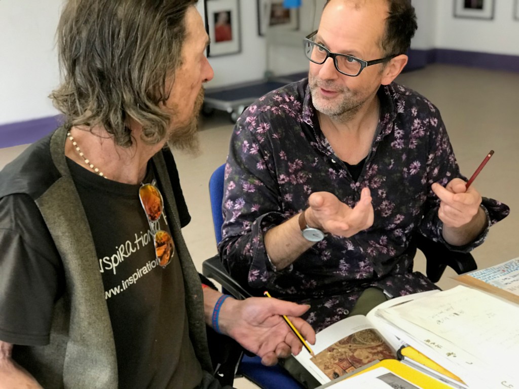 The ethics behind The Book of Ours and Homeless Library projects: “the story is theirs to tell.”  How do the leaders of arthur+martha fulfill this remit when it is they who have planned, organized, and conducted, and participated in the lives and imaginations of people with the lived experience of homelessness?  They come with various marks of visibility and power that a society based upon inequality confers on some but denies to others.  Phil Davenport and Lois Blackburn, along with their colleague in music Matt Hill, acknowledge the privilege—with its access to workshop space, funding, and education—as they are vigilant about reducing to a minimum the temptations of appropriation and exploitation of the precarious vitality of other lives.  They characterize their roles as “curators or midwives” (Matt Hill) of lives and works not their own.  They are conservationists in the way that poets, from the beginning of recorded poetry, “conserve the image of a person across time” (Allen Grossman).  They facilitate, rather than control and interpret, an event of living and shaping.