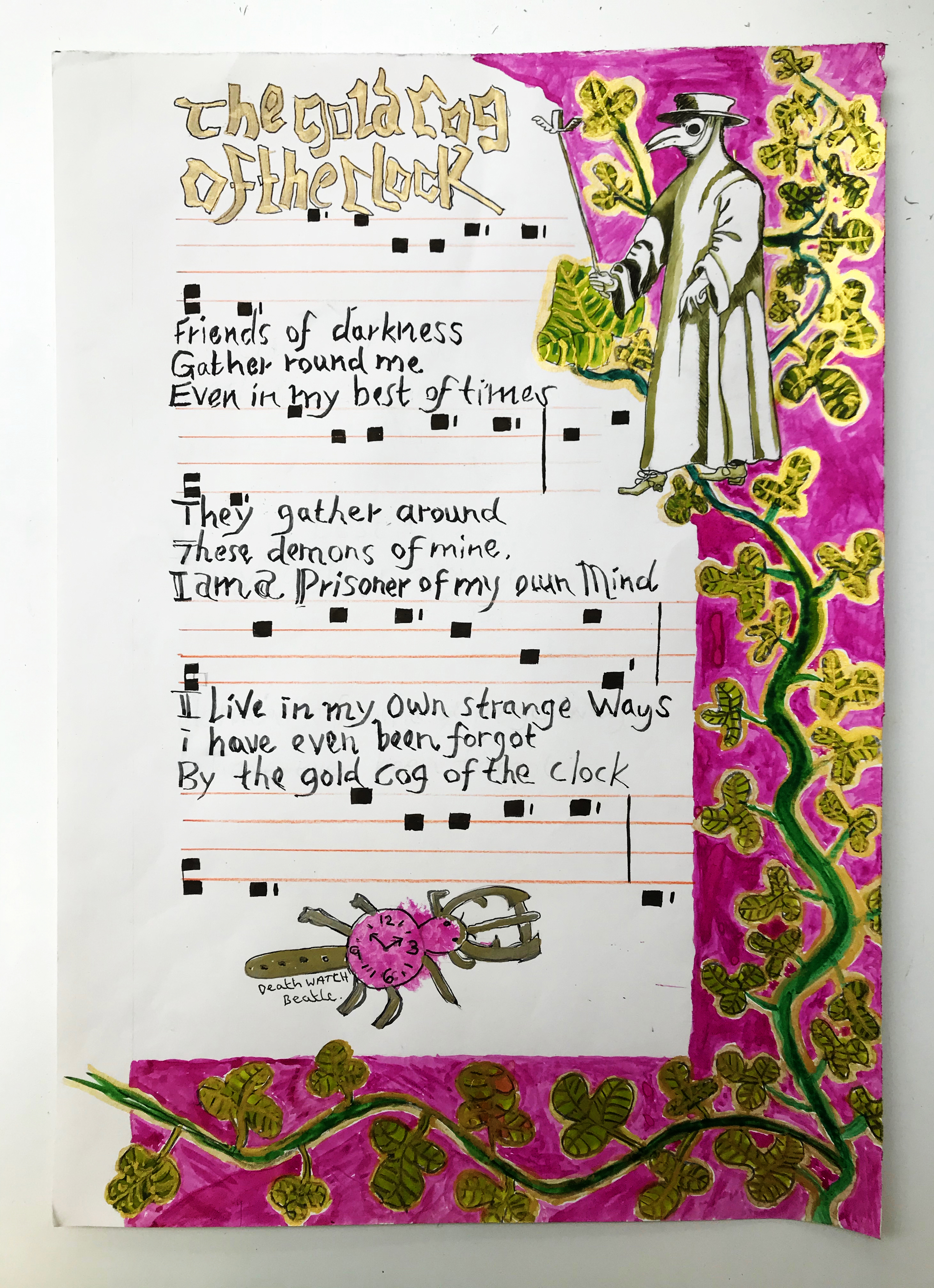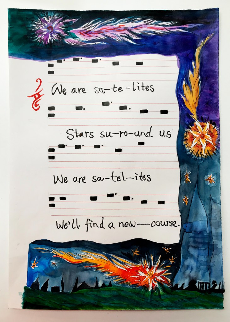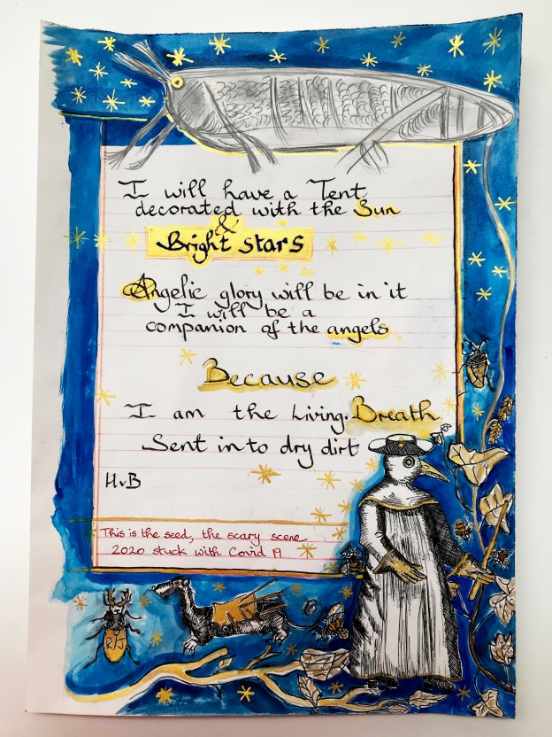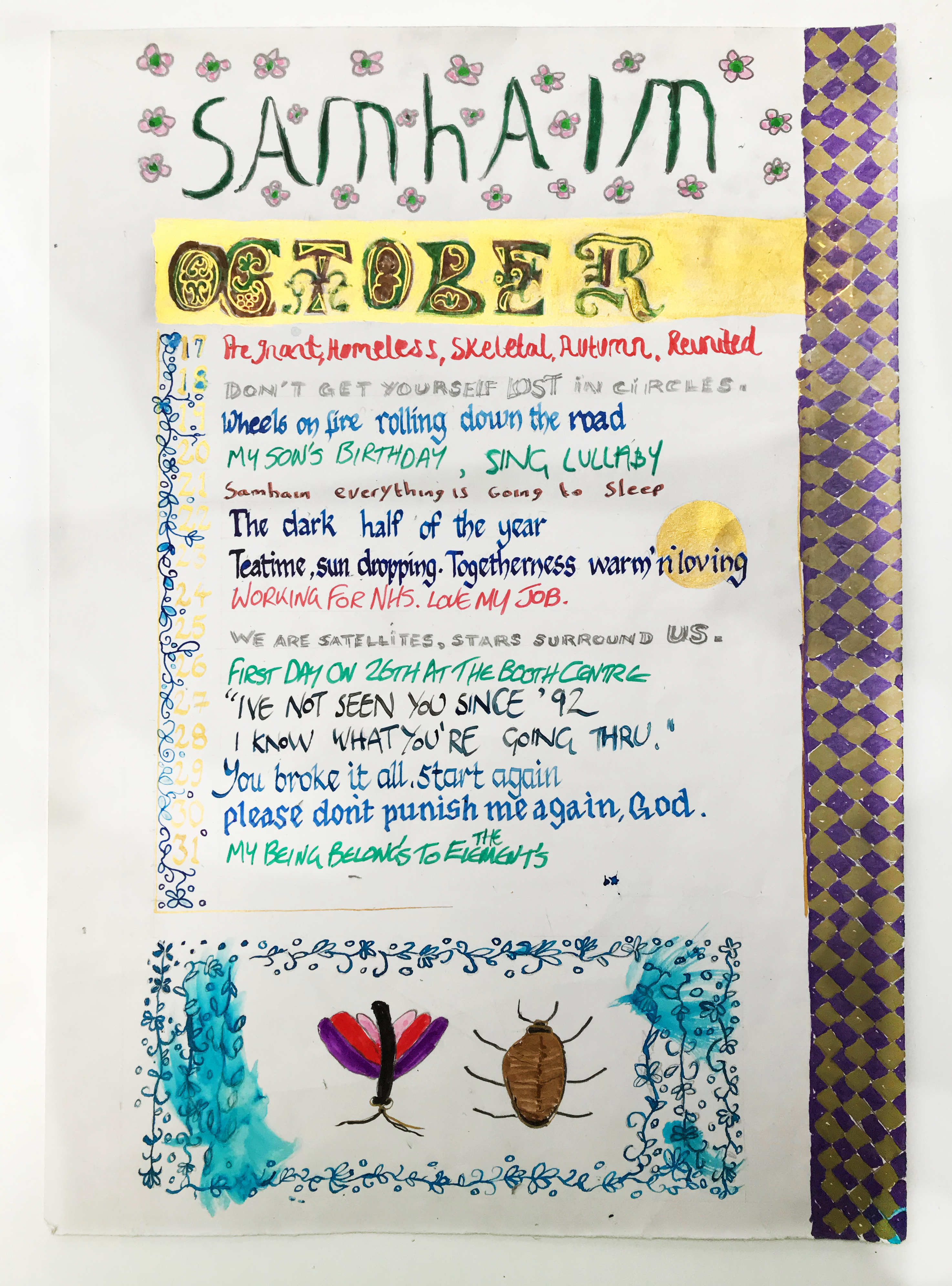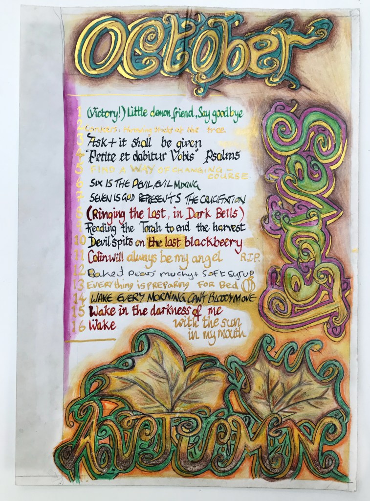 Usually representing mechanical circles, here the cogs belong to the generative source of the sun.  The second line has been snatched from Lawrence’s poem and song, being made to live again in a new context.  “Round”ness becomes support and even transformation: “the seasons bring us round again.”  In the midst of the cycle of an expression of malign and indifferent forces controlling one’s subsistence emerges the will and the vision: “you can TURN things around better.  The following calendar lines from October, each line composed by a different person, are heart-rending; they convert private pain into a vision of cosmic coherence: