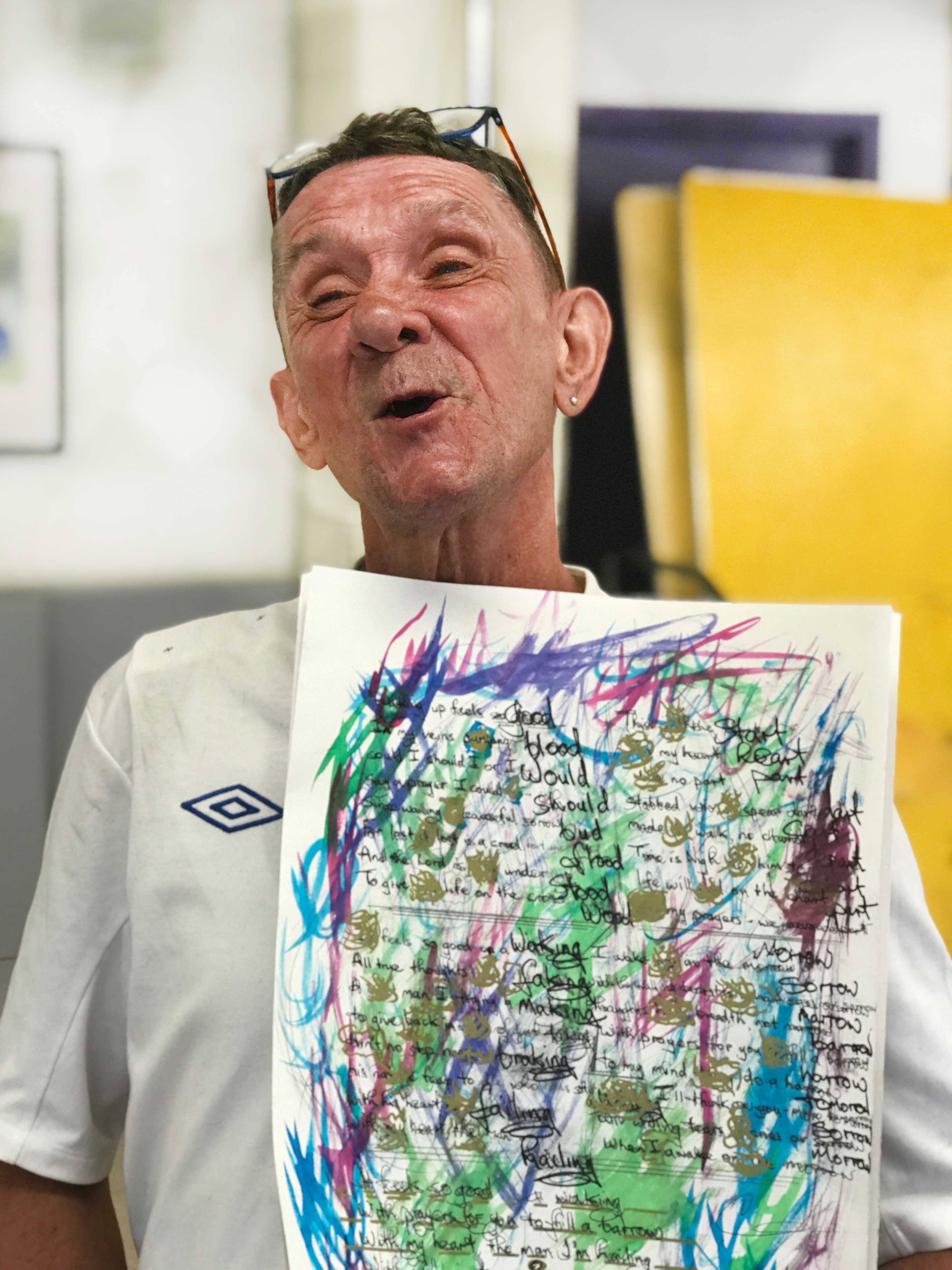 A man called J came into a music session and, listening to Matt’s guitar, asked if he could borrow it for a moment.  A very good player, he began a striking melody, which Matt immediately recorded.  Matt asked J to repeat it but he suddenly became shy.  Matt nonetheless placed it as an undersong to “Killing Floor,” returning to the fragment throughout the song.  J didn’t know where his melody came from: an unidentified shard of musical history saved from oblivion by Matt’s attentive and practiced ear, a disarming presence not interpreting but apprehending and conserving something of value.  Commissioning becomes a form of collective artistic practice: I will do some of the work on your behalf . . , but, says Lois, “we are always checking where the power is,” making sure that noone’s authority gets usurped by another’s.  To intervene or enhance often means to compensate for a severe handicap—most evident, the leaders come to their project with acquired training: when they see a blank page, they know how to begin filling it up, with language or with design.  Without that experience, a person “comes [to the page] naked into the world,” terrified of a boundariless emptiness.  The leaders give them boundaries, coordinates.  The artist Lois draws a horizontal line, puts in an image, marks out a space for a text; the poet Phil lineates the poetic speech of a participant.  Phil, Lois, and Matt, along with the other makers around the table, abolish the terror of creation in isolation.